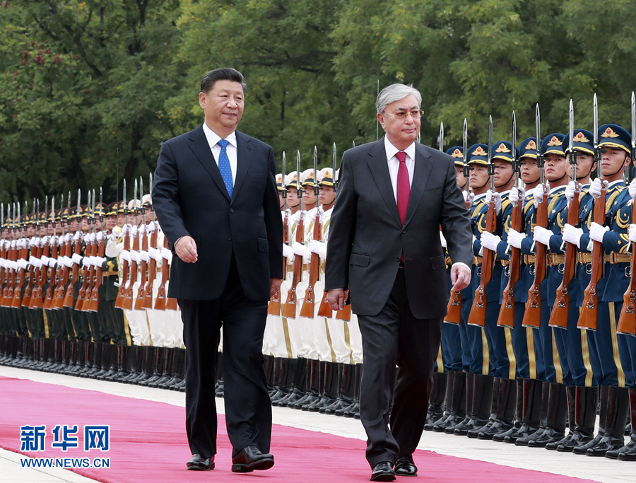9月11日,国家主席习近平在北京人民大会堂同哈萨克斯坦总统托卡耶夫举行会谈。这是会谈前,习近平在人民大会堂东门外广场为托卡耶夫举行欢迎仪式。 新华社记者 姚大伟 摄